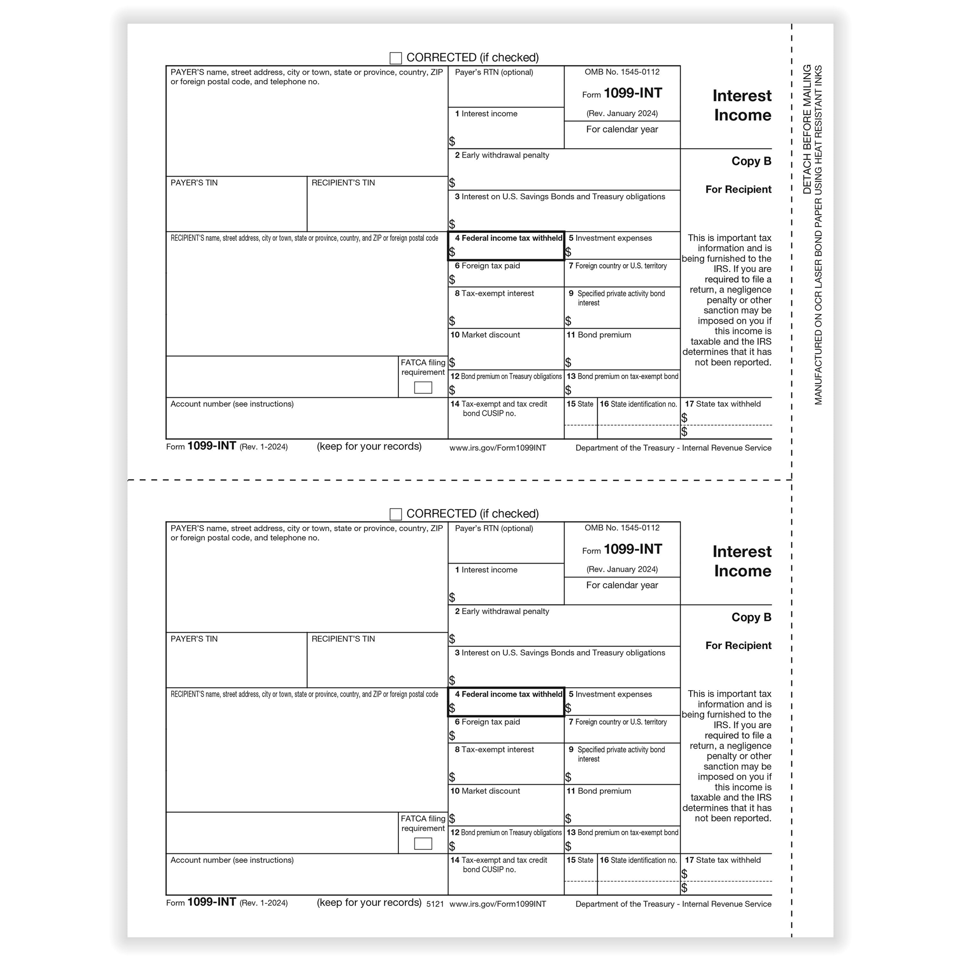 • Report interest paid to each person to whom you have paid at least $10 of interest during the year with 1099-INT forms • Recipient Copy B • Laser cut sheets • Printed with heat-resistant ink for use with most inkjet and laser printers