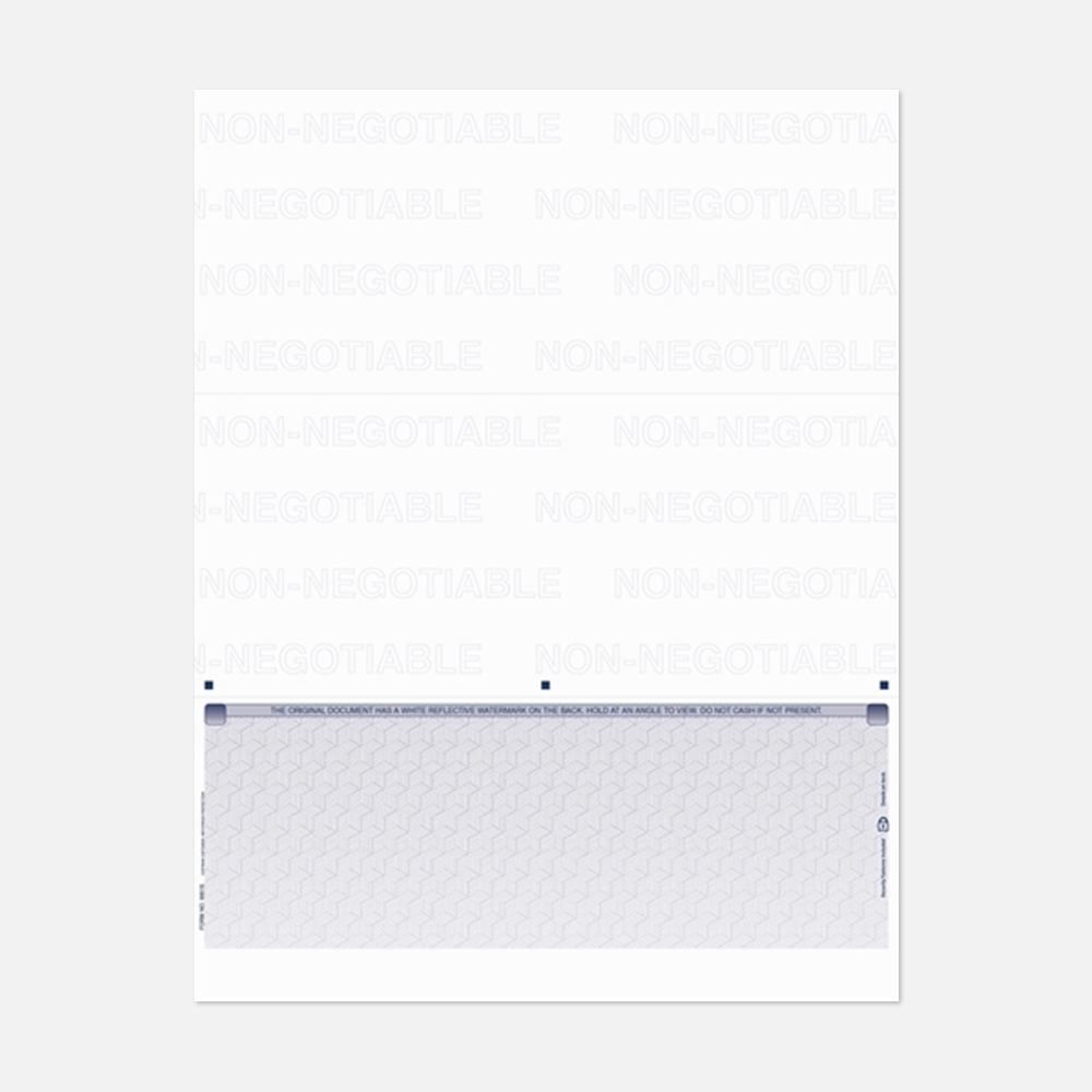 8-1/2" x 11" Secure Check – Bottom, Green/Blue/Green. Features artificial watermark, digital SS void pantograph, bleach VOID sensitivity, warning band, LaserLock, microprinting, and control number. 2,000 checks per box. Ships in 1–2 business days.