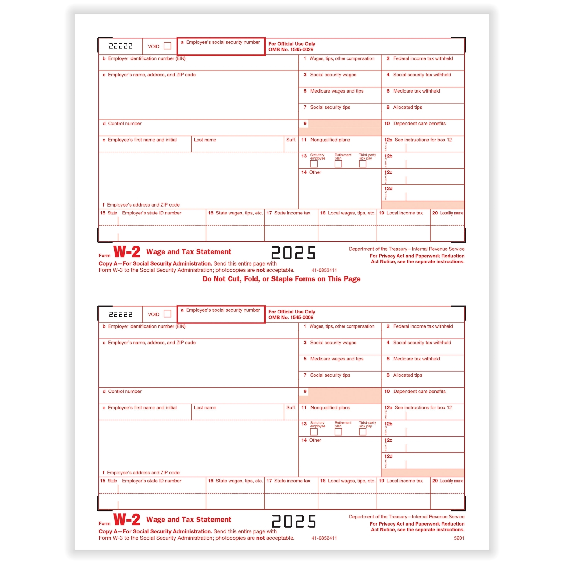Effortlessly manage your employee tax reporting with our Laser W-2 4-Up Horizontal Forms. Each sheet includes Copies B, C, 2, and 2 combined, ensuring accurate and efficient filing. Order now for a hassle-free tax season!